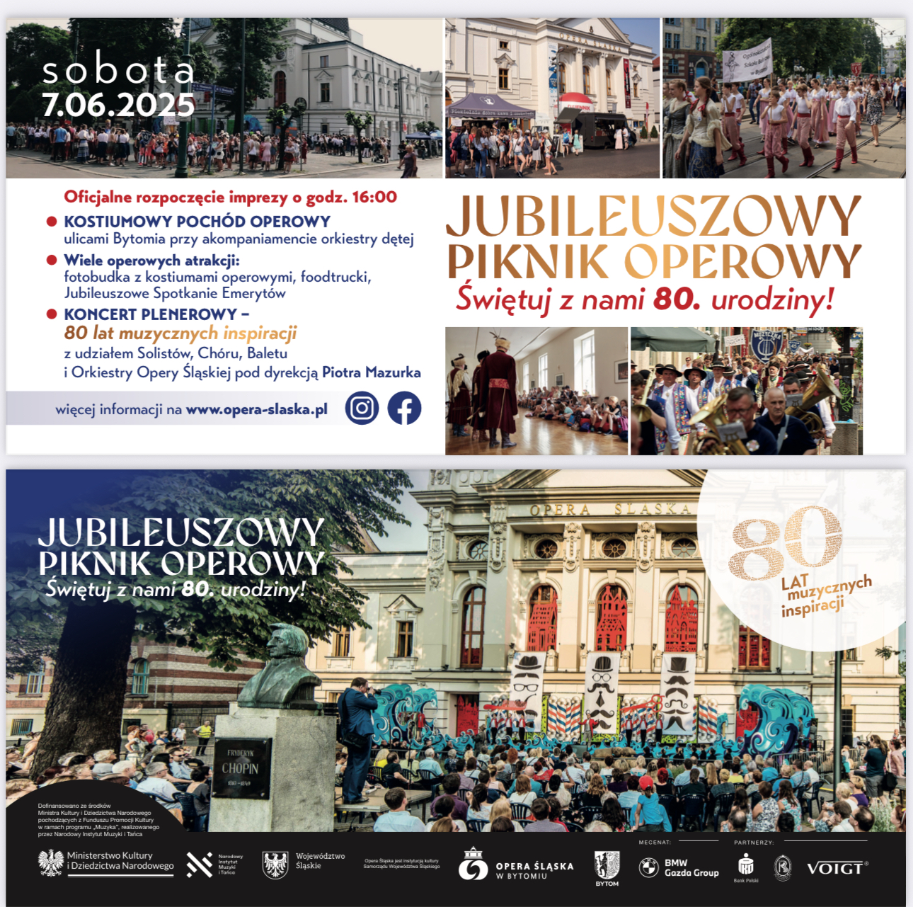 7 czerwca godz. 16.00 Jubileuszowy Piknik Operowy z okazji 80 lecia powstania Opery Śląskiej Otrzymaliśmy zaproszenie z Opery Śląskiej na Jubileuszowy Piknik Operowy z okazji 80 lecia powstania tej instytucji Szczegóły na stronie www.opera-slaska.pl
