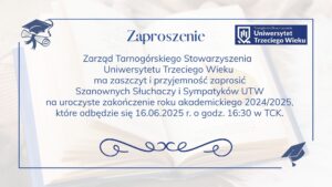 Zapraszamy na podsumowanie i zakończenie roku akademickiego 2024/2025. Odbędzie się ono w sali widowiskowej Tarnogórskiego Centrum Kultury. Będzie się składało z dwóch części.