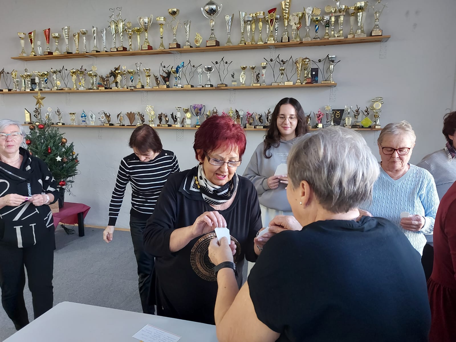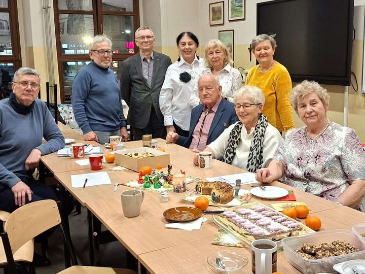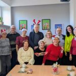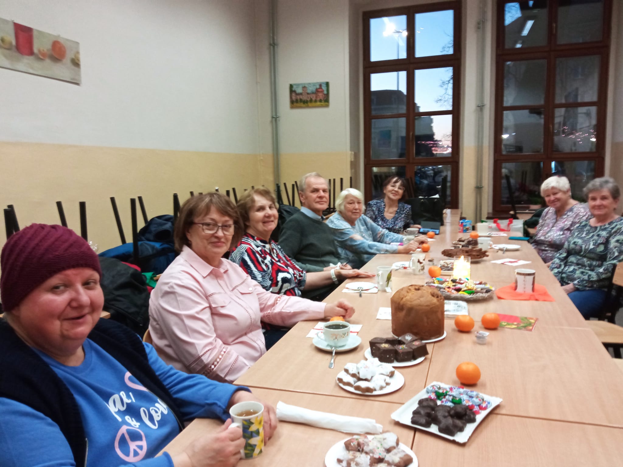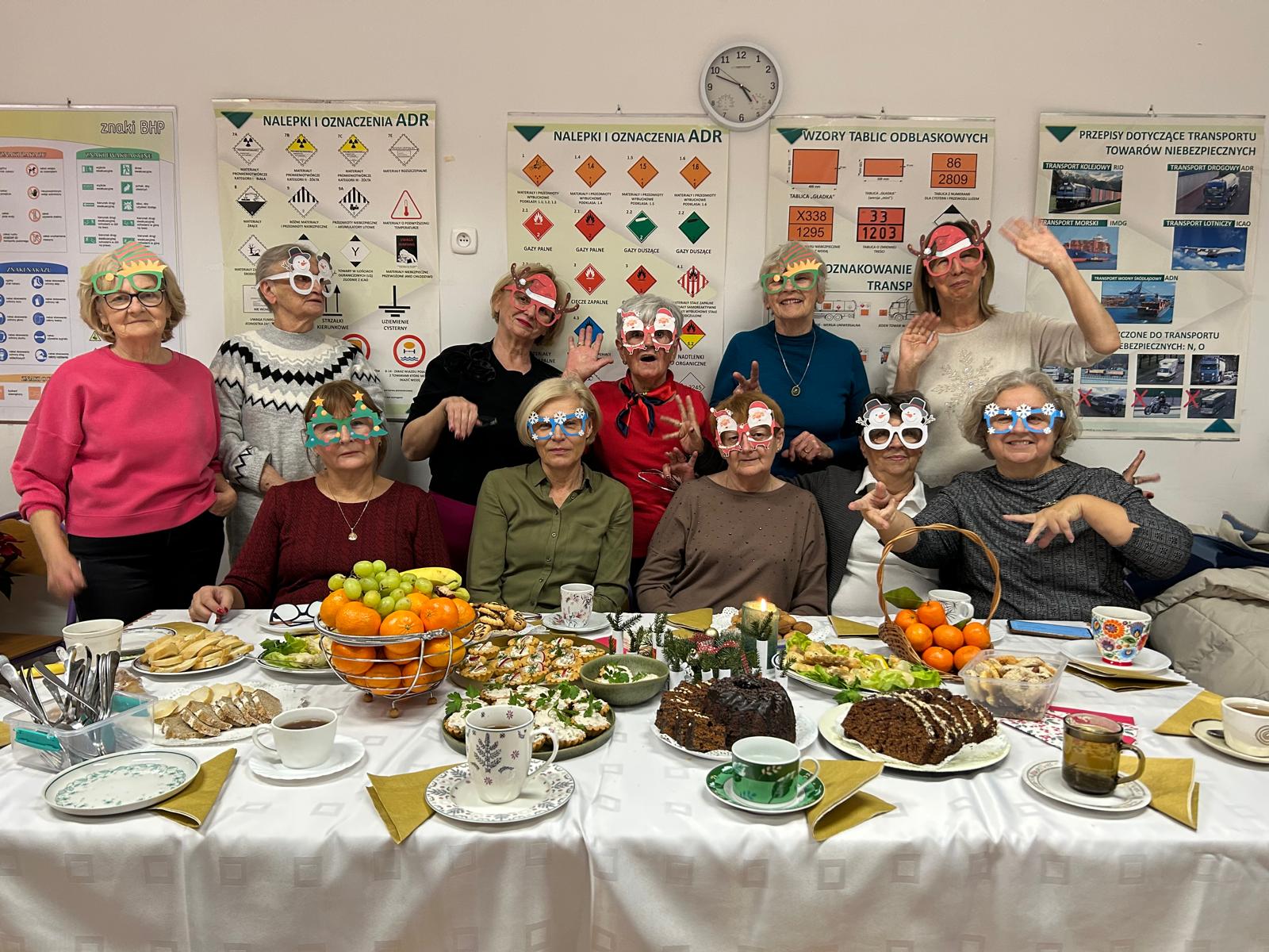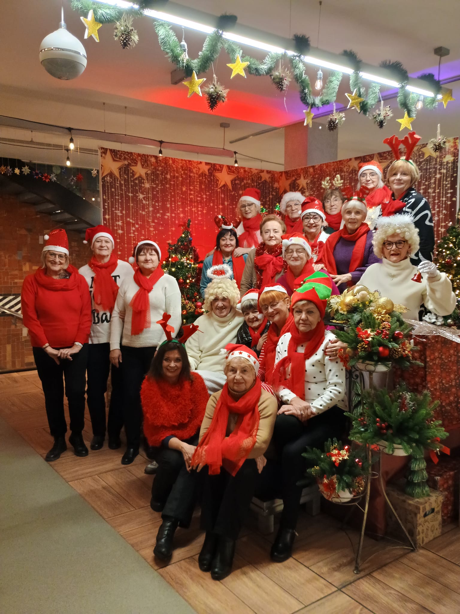 Przy skromnie, ale z sercem przygotowanych świątecznych stolikach gromadziliśmy się jak jedna, dobra rodzina. Był czas na rozmowę, uśmiech i życzenia płynące prosto z serca. To nie tylko stół jednoczył była też prawdziwa dawka MOCY i ENERGI wieńcząca odchodzący rok – uczestniczki gimnastyki rozciągającej, eleganckie , rodzinne zdjęcie zespołu „a-gie” , wizyta Mikołaja z prezentami u malarek, pozdrowienia od kucharek i grupy fitnessowej, łamanie się opłatkiem zespołu „Frajda”