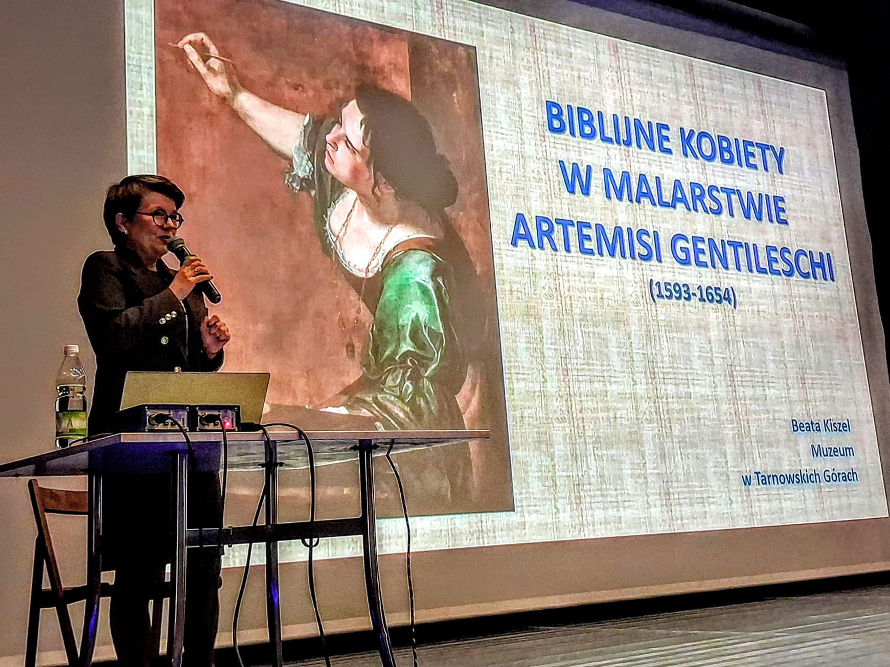 Ostatni nasz wykład odbył się w szczególnym czasie, bo w poniedziałek w Wielkim Tygodniu, co nadało mu wyjątkowy, refleksyjny charakter. Gościliśmy panią Beatę Kiszel, dyrektorkę tarnogórskiego Muzeum, która w fascynujący sposób przybliżyła nam temat biblijnych kobiet w sztuce. Centralną postacią niezwykle interesującej prelekcji była Artemisia Gentileschi – wybitna malarka epoki baroku, uczennica swojego ojca Orazio Gentileschiego, której życie i twórczość poruszają do dziś. Prelegentka z dużą wrażliwością opowiadała o dramatycznych doświadczeniach artystki, podkreślając, jak głęboka trauma młodości (gwałt dokonany na niej, gdy była siedemnastoletnią dziewczyną) odcisnęła się w jej dziełach. Być może dlatego szczególne miejsce w jej twórczości zajęły wyobrażenia silnych kobiet biblijnych, np.: Judyty, Zuzanny, Batszeby czy Marii Magdaleny – ukazane nie tylko jako bohaterki znanych historii, ale także jako symbole odwagi, godności i wewnętrznej siły.